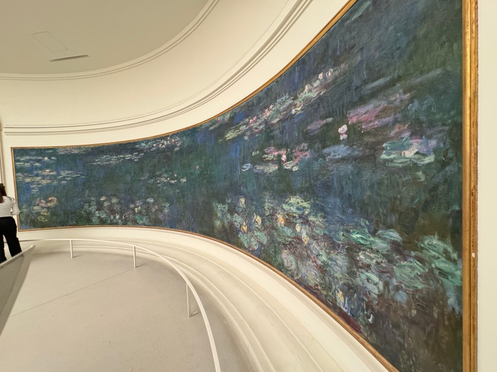 The works are held in two oval rooms. They form the infinity symbol. Monet himself requested natural light and for the works to be viewed in silence. They are spectacular and worth the effort. The building is cool and calming and welcome reprieve from the heat and crowds outside.