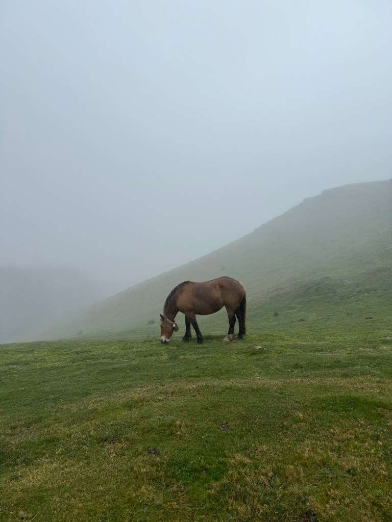 After breakfast of bread and jam it’s off we go. There are a group of us all women from all over the world my Irish friend and I slip behind as the others are just faster. As we walk the conditions are cold misty and visibility is poor. The road is steep there are horses and sheep and farming life to see. This land reminds me of where I grew up. It’s beautiful. We come to a food truck and stop for coffee which is strong and hot there are no seats but a wall to lean and sit on. One of my bunk mates is not feeling great and we all check on him and make sure he has some food and drinks.